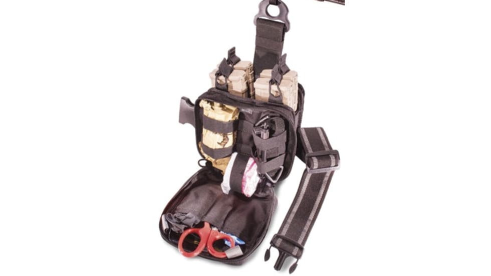 The T.A.S.K. with P.T.K. is a leg rig that holds four AR-15/M4 magazines, EMT shears, latex gloves, surgical tape, modular bandage, tourniquet, and a chest seal. It's made of rugged 1680-denier black ballistic nylon and double-layered scuba webbing.