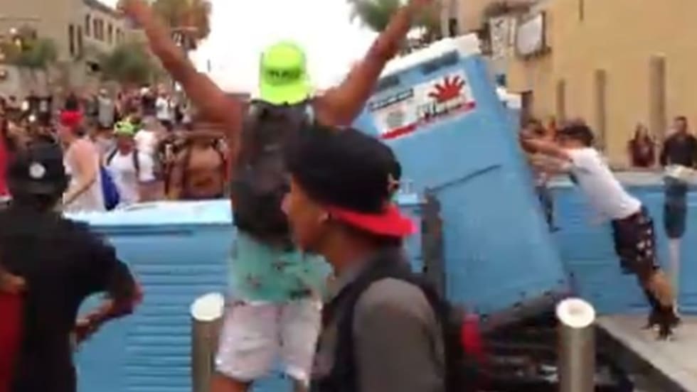 Huntington Beach (Calif.) Police officers arrested seven people, including a man who struck an officer with a skateboard, during a wild melee Sunday after the U.S. Open of Surfing.