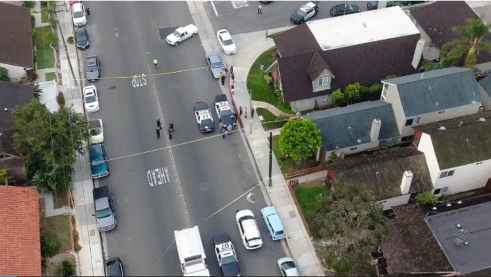 Two Huntington Beach, CA, police officers and one suspect have been hospitalized with non-life-threatening gunshot injuries after police were called to check on a report of a man running about slashing car tires Thursday morning.