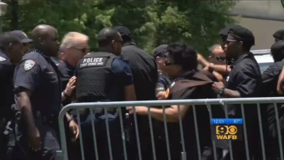 Police say the seven members of the New Black Panther Party refused to leave and "attempted to storm the police barricade." One officer was injured.