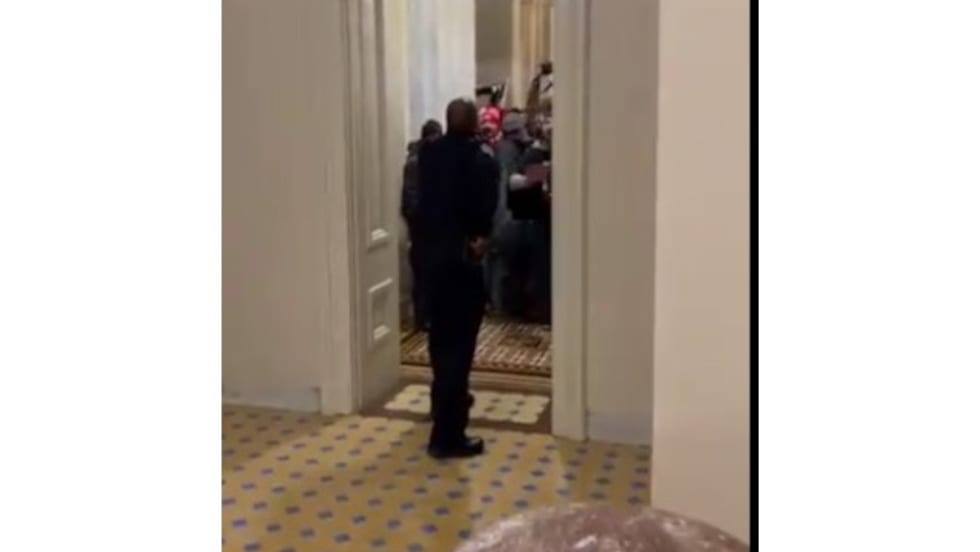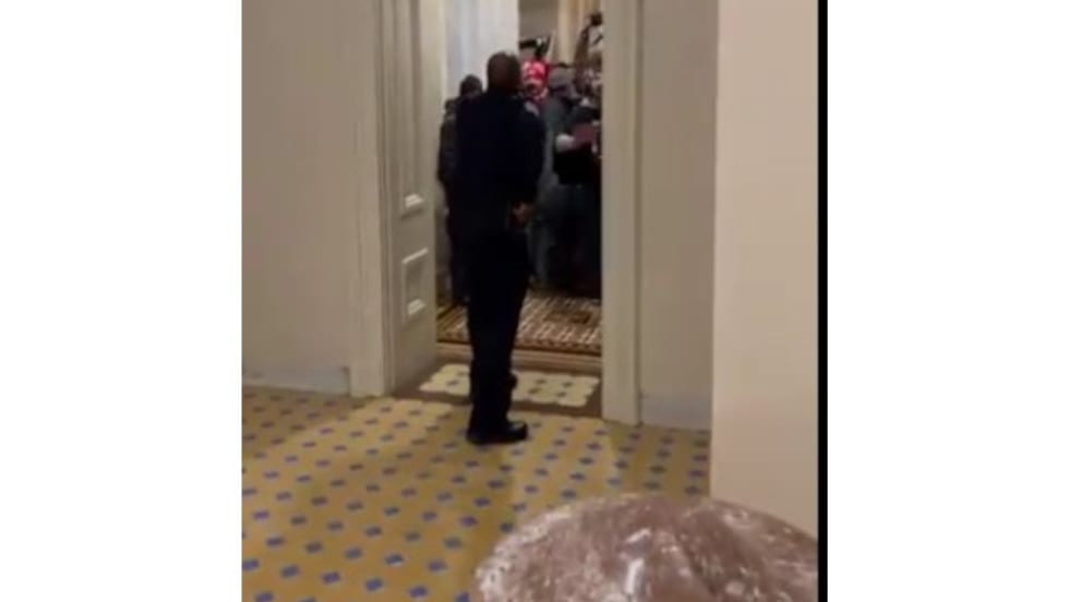 The officer is seen reaching for his holstered handgun before picking up a baton from the floor and swinging it at the rioters as he backs away from the surging crowd.