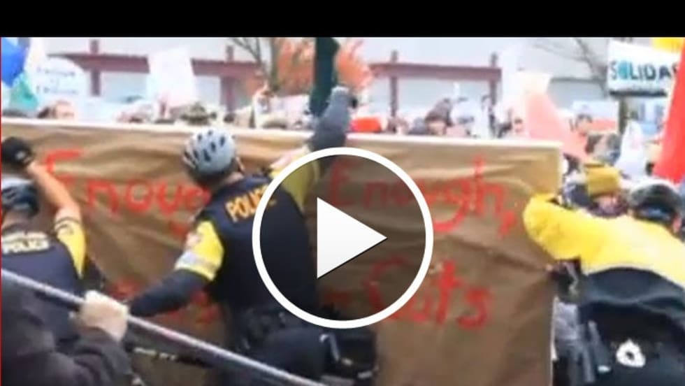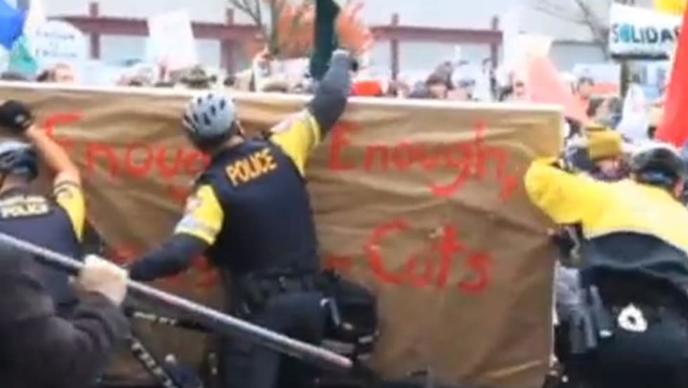 Portland Police Bureau officers pepper sprayed demonstrators in Northeast Portland on Saturday while attempting to defuse a rally protesting cutbacks in city social services.