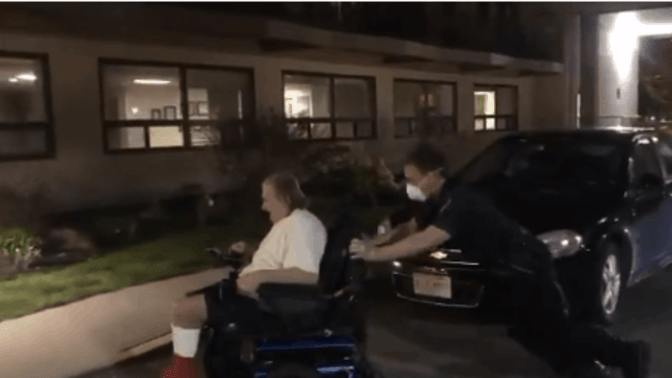 An officer with the Quincy (MA) Police Department was captured on social media video helping a man get home after his electric scooter lost power.
