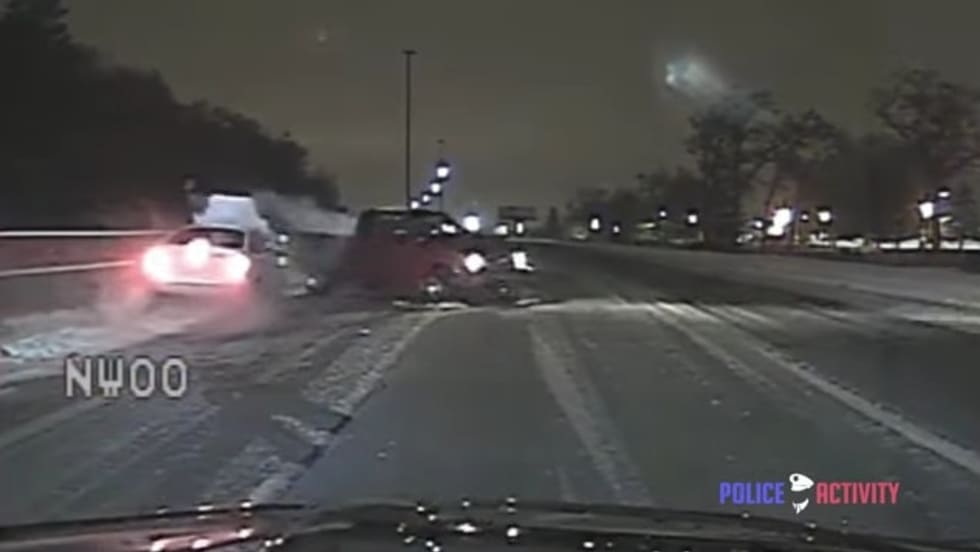 Wyoming, MI, Police have released dash camera video of an officer and a woman being struck by a vehicle on a snowy stretch of northbound US-131.