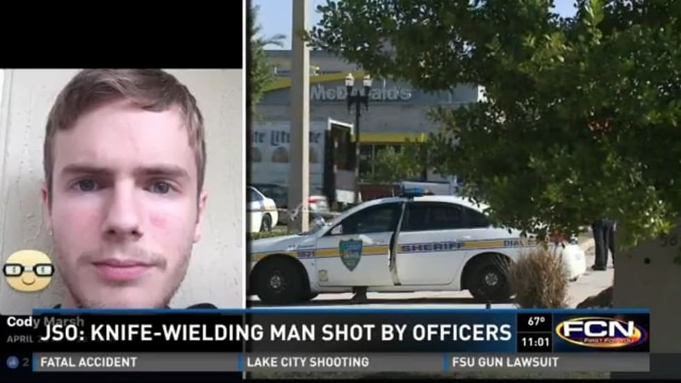 Jacksonville, FL, police shot a man who they said charged at them wielding both a machete-style knife and a dagger-like knife while threatening to cut their heads off Saturday morning.