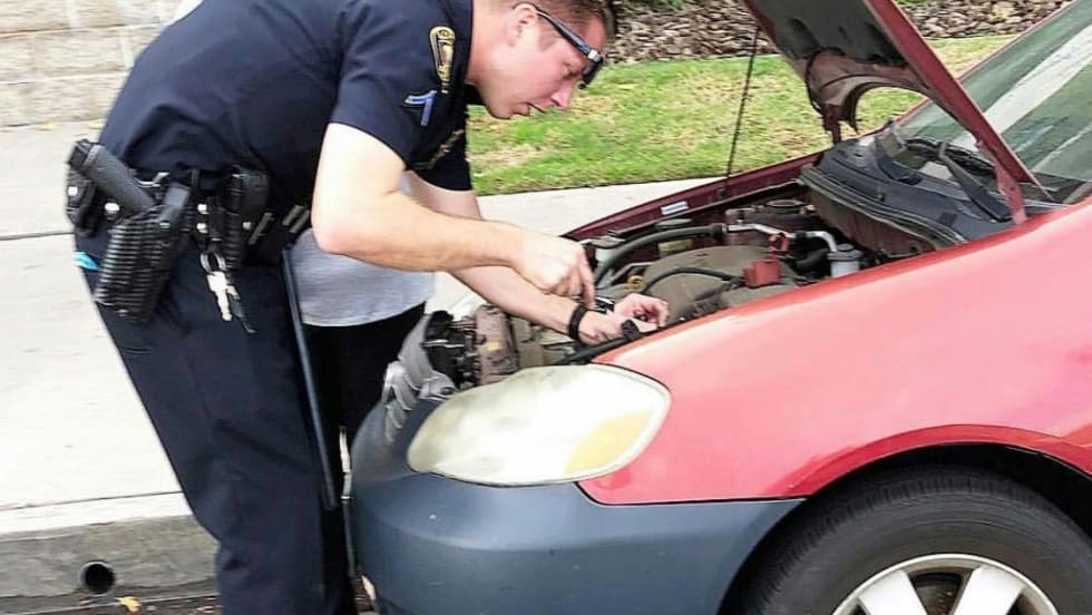 An officer with the Long Beach (CA) Police Department was captured in an image making the rounds on social media installing a replacement car battery after a woman reported her original battery stolen.