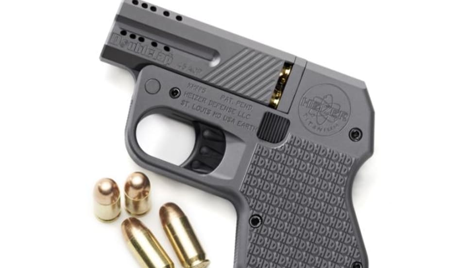 Heizer Defense has introduced the DoubleTap, a slim and light pocket pistol available in .45 ACP or 9mm with a four-round capacity. The pistol offers an unusual break-action feature and ambidextrous thumb latch controls. Heizer is touting the pistol's engineering and manufacture at an aerospace facility.