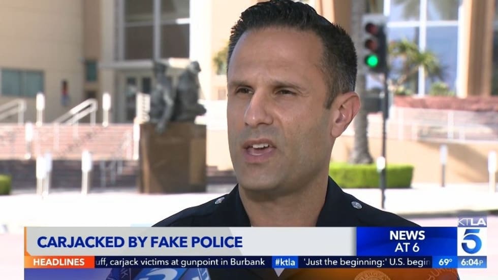 Officers learned the victims had been carjacked at gunpoint by two men wearing shirts with the word “POLICE” written on the front, Burbank police said.