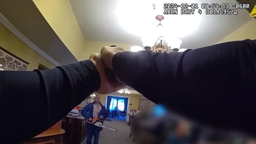 The suspect ignored the order...and fired up the chainsaw. The officer deployed his TASER, knocking down the suspect. But before he could be taken into custody, he got back up, grabbed the running chainsaw, and ran toward the officer.