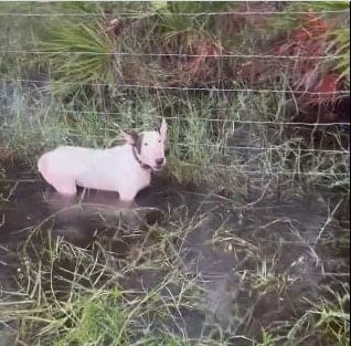 A trooper walked toward the dog, who was tied to a fence and standing in a deep puddle that reached the animal’s stomach. The dog growled but the trooper managed to untie him and took him to safety.