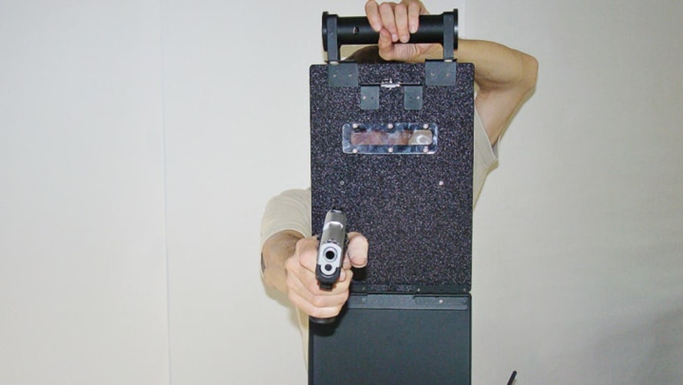The Trooper ballistic shield is a clipboard designed to stop a bullet to the neck, face, or head once deployed.