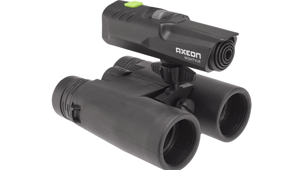The Axeon NightVue mounts to most porro and roof prism binoculars and beams a powerful 520 nanometer green laser out to distances up to 250 meters. The green color of the NightVue emitter cuts through haze and fog while also having a low effect on personal night-time vision.