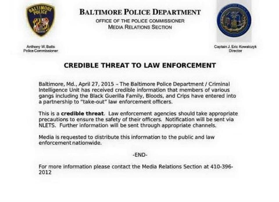Read More →Police said in a statement they have received information that members of "various gangs" — including the Black Guerrilla Family, the Bloods and the Crips — have "entered into a partnership" to harm police.