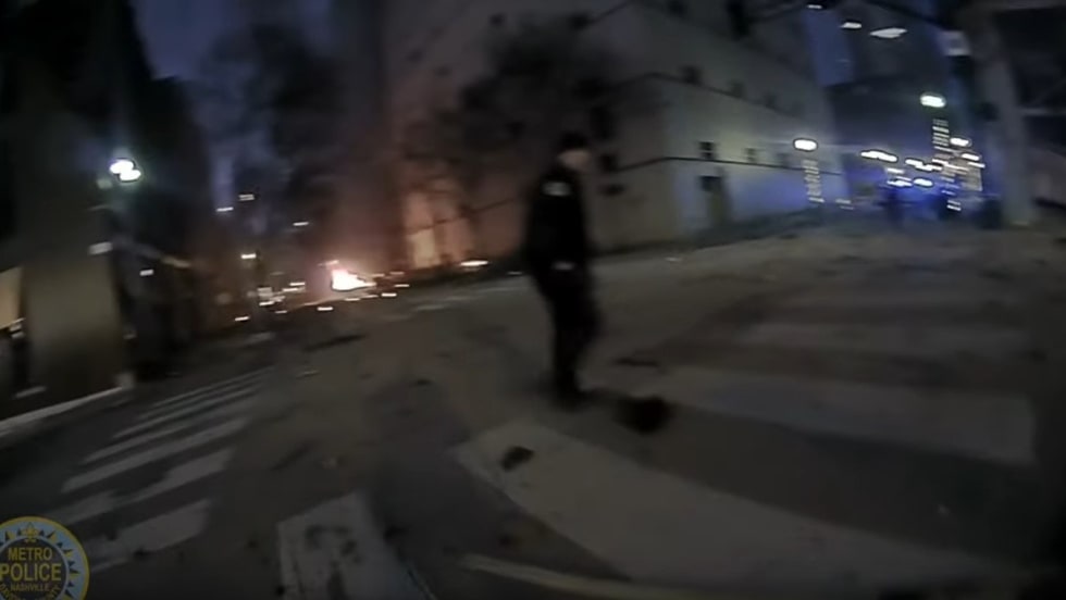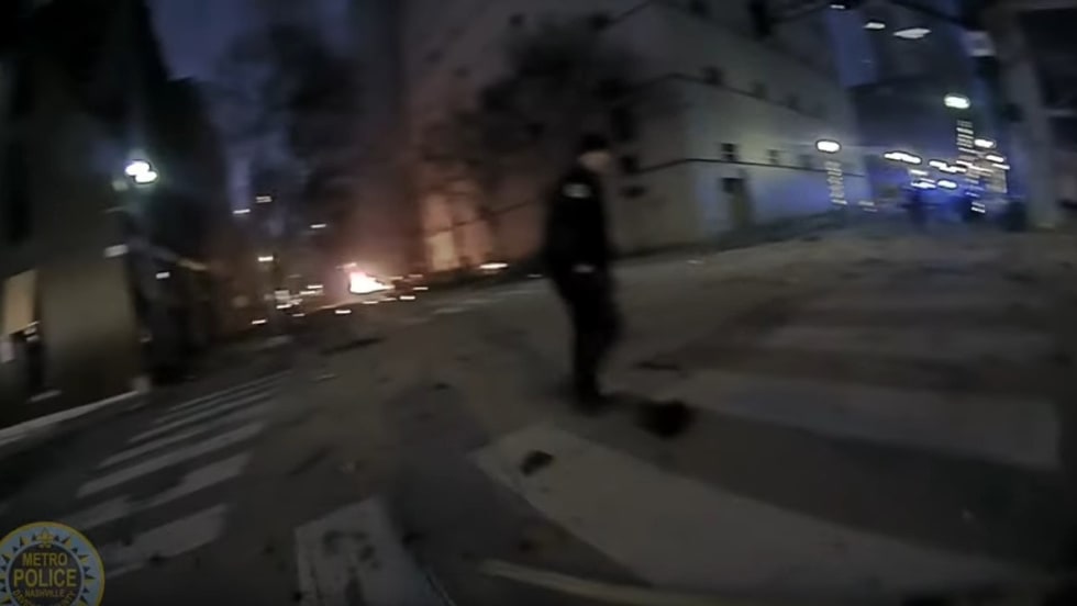 The time was 6:25 a.m. on Christmas morning. Nashville police worked quickly to clear 2nd Avenue North downtown, the stretch that houses the entertainment district. Officers can be seen walking past B.B.King’s Club as they evacuated buildings. As they moved down the sidewalk, holiday music from a store mixed with the eerie recording coming from a white RV parked on the street.