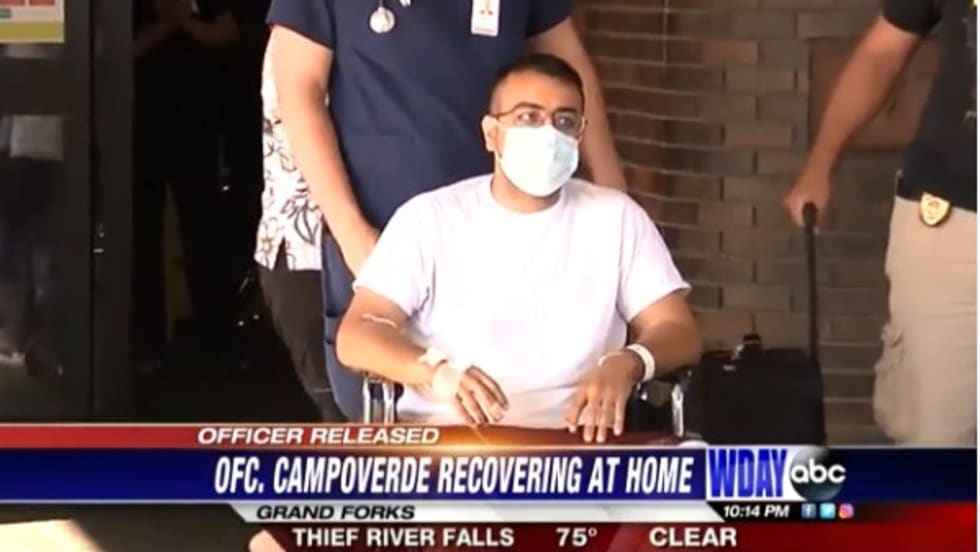 Officer Lucas Campoverde was shot in the line of duty in mid-August. He had been in intensive care for nearly two weeks following the shooting but emerged from the entrance to the hospital and stood before a gathering of law enforcement officers who came from all around the region to wish him a speedy recovery.
