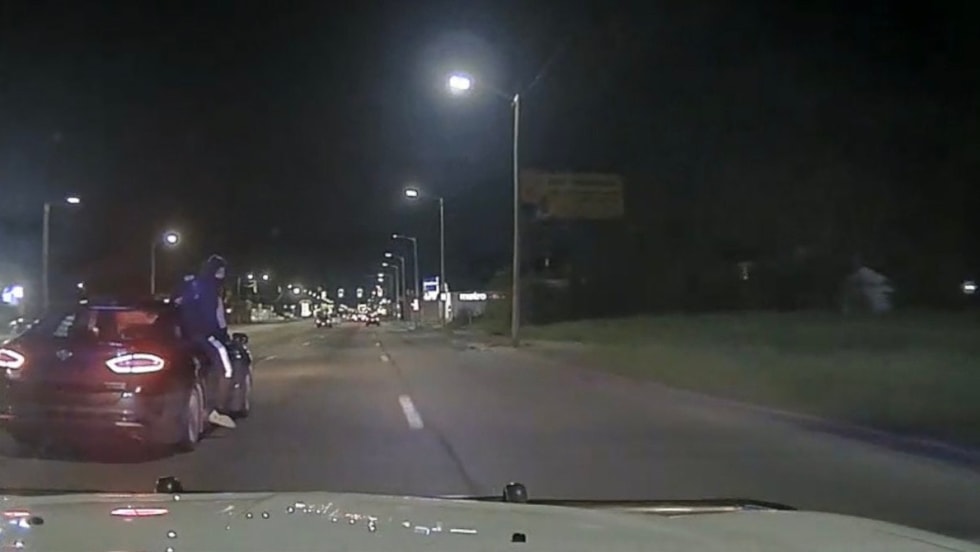Police say someone inside the car fired shots at the patrol car striking it several times during the pursuit. The rear-seat passenger, shown hanging out of the car in dashcam images, was armed with a 9mm handgun, according to police..