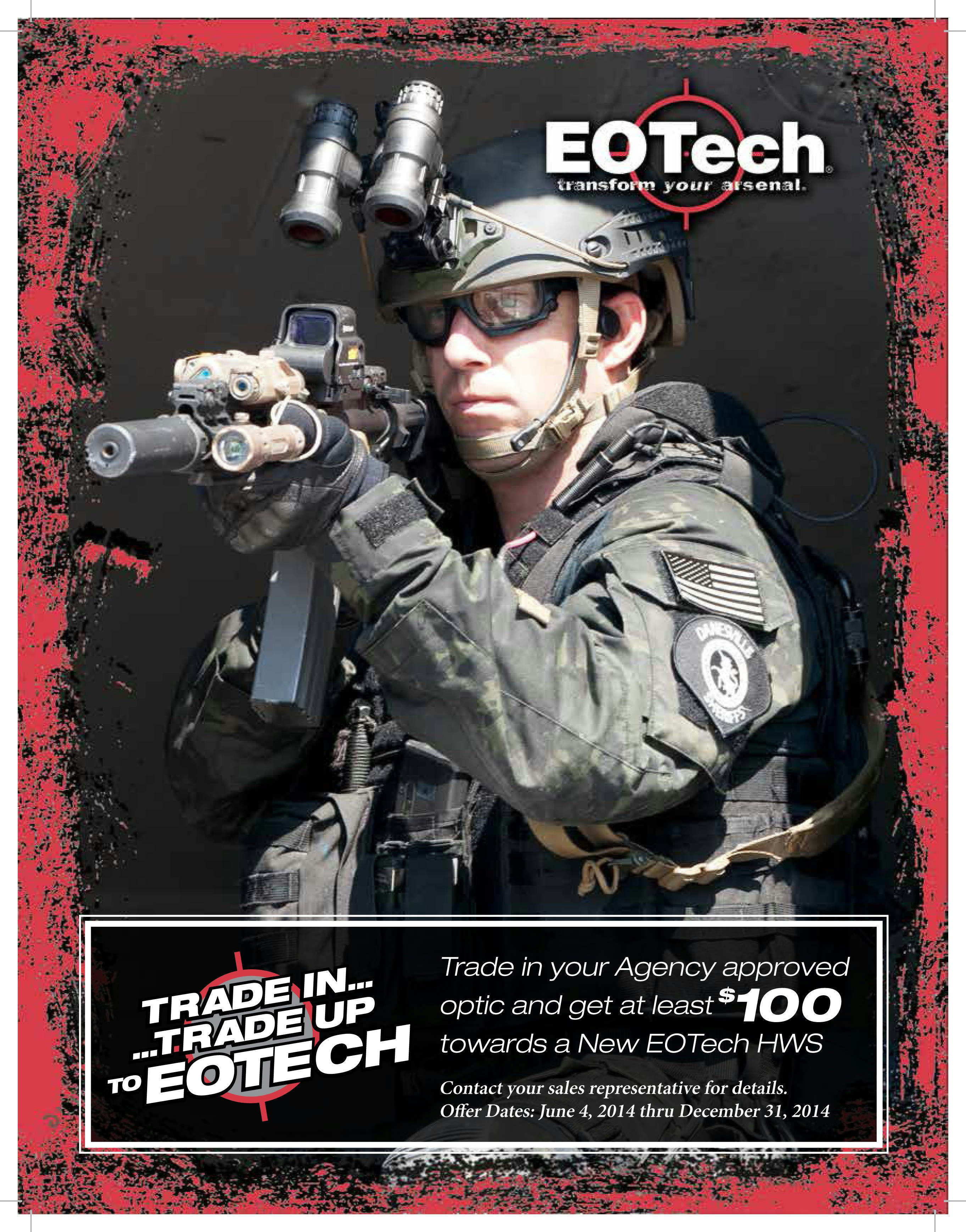 Read More →EOTech has announced its first-ever Law Enforcement Trade-In/Trade-Up Program. From now until December 31, 2014, this program will provide law enforcement officers and agencies with a local in-store redemption, ranging from $100 to $225, when trading in an old agency-approved optic for a new EOTech Holographic Weapon Sight.