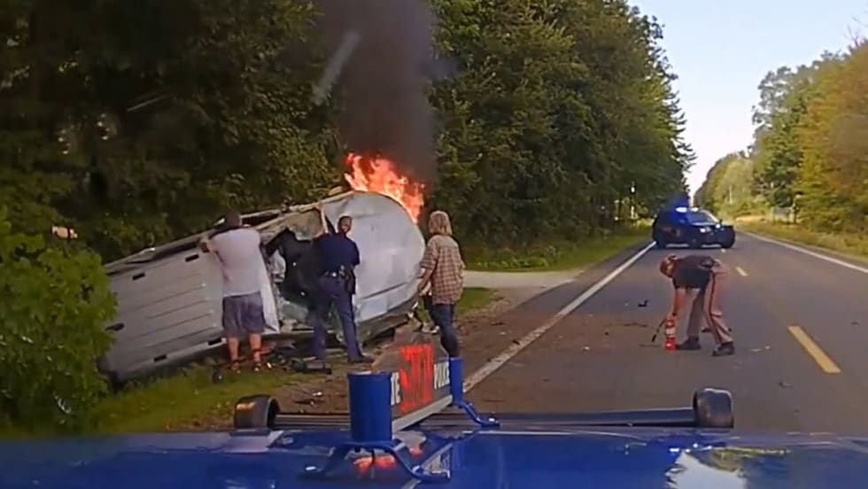 When the trooper arrived, flames were visible from the engine compartment, and she immediately ran to the overturned vehicle and began trying to break the windshield using her hands, arms, and feet to gain access to the driver who was trapped inside.