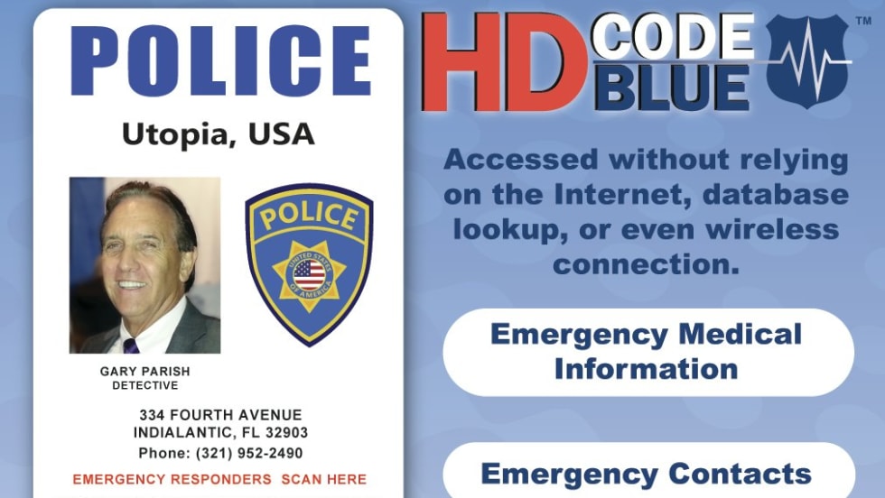 HD Barcode's HD Code Blue provides agencies with the ability to store officers' comprehensive medical data and emergency contact information in code that can be printed on existing or new ID cards.