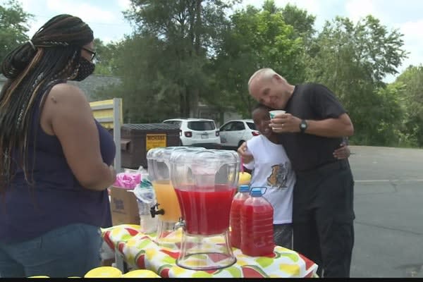 An officer with the South Bend (IN) Police Department was seen over the weekend helping two boys—a 12-year-old and his four-year-old brother—serving refreshments of lemonade, punch, and popcorn to area residents.