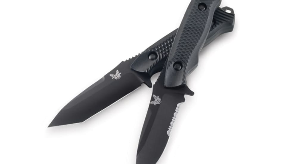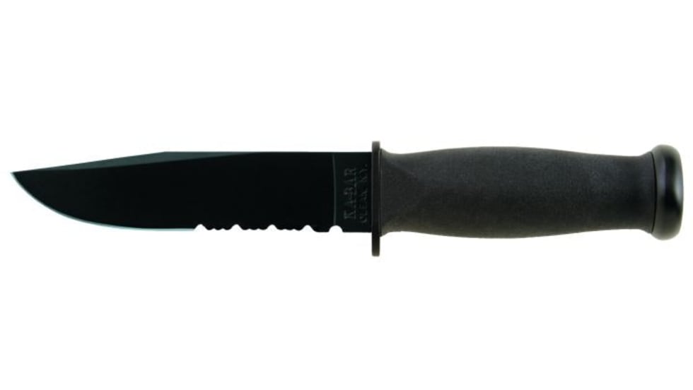 The Mark I features a 5 1/8-inch blade and measures 9 3/16 inches overall. Offered with a leather or Kraton handle, the Mark I is available with either a straight or serrated edge in 1095 Cro-Van.