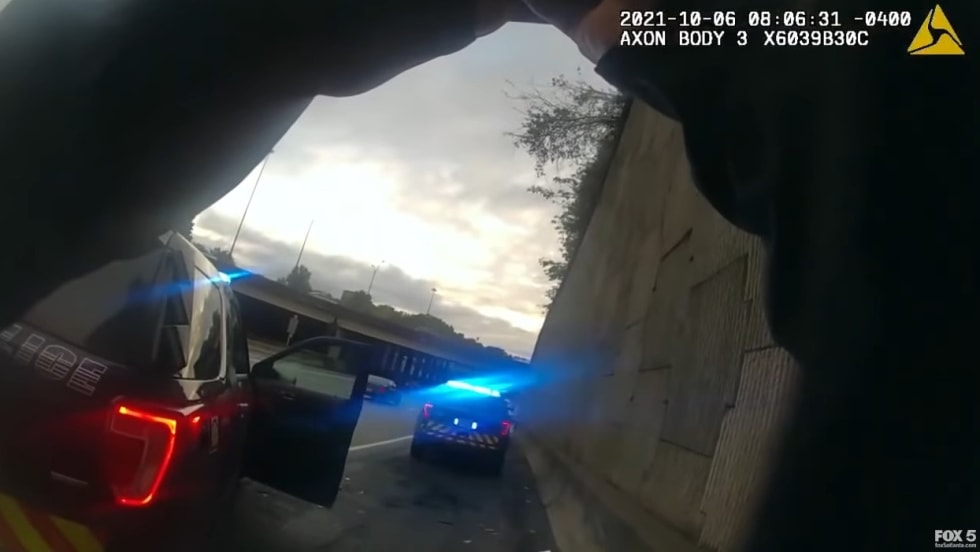 As he is about to take a photo, Officer Randerson is hit by a car. The video shows chaos for the next five seconds in quick flashes.