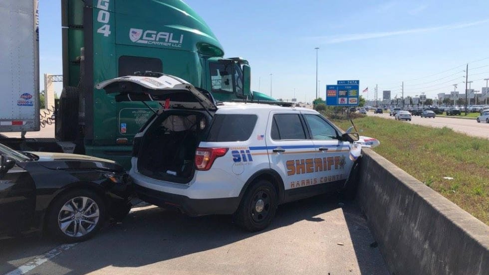 A deputy with the Harris County (TX) Sheriff's Office was injured when a tractor-trailer truck struck his patrol vehicle as well as another car early Wednesday.