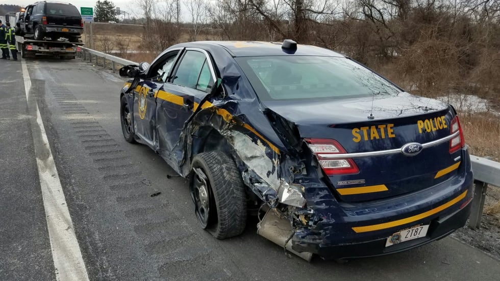 A trooper with the New York State Police suffered minor injuries when a tractor trailer truck struck his vehicle as he was assisting a disabled vehicle.