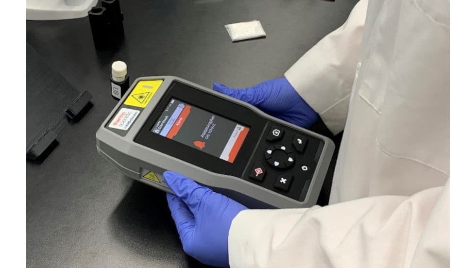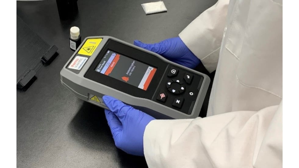 The handheld device uses Raman spectroscopy for presumptive narcotics identification in the field so that officers can make safe, definitive decisions.