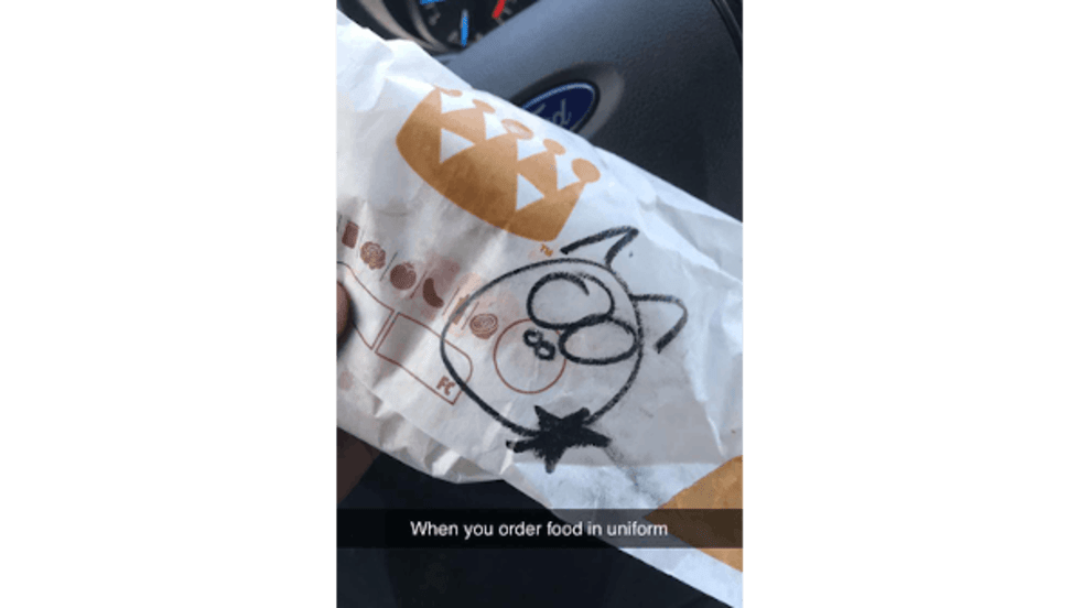 An officer with the Clovis (NM) Police Department took his shift meal break at a local Burger King restaurant on Thursday and was disappointed to discover that on the wrapper of his order was a drawing of a pig.
