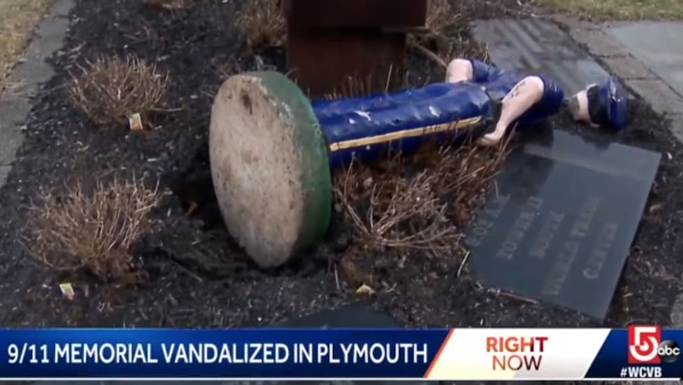 Vandals knocked over a statue of a police officer and left it in pieces at a 9/11 memorial in Plymouth, MA. A nearby figure of a firefighter was untouched.
