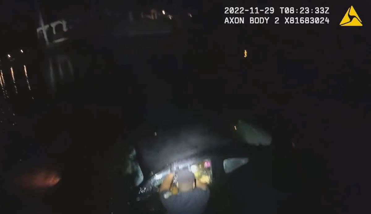 Upon arrival he sprints to the water, asks another officer for a baton, then quickly jumps in the water. He repeatedly struck the driver’s side window until it smashed, then pulled the woman out as water rushed in.