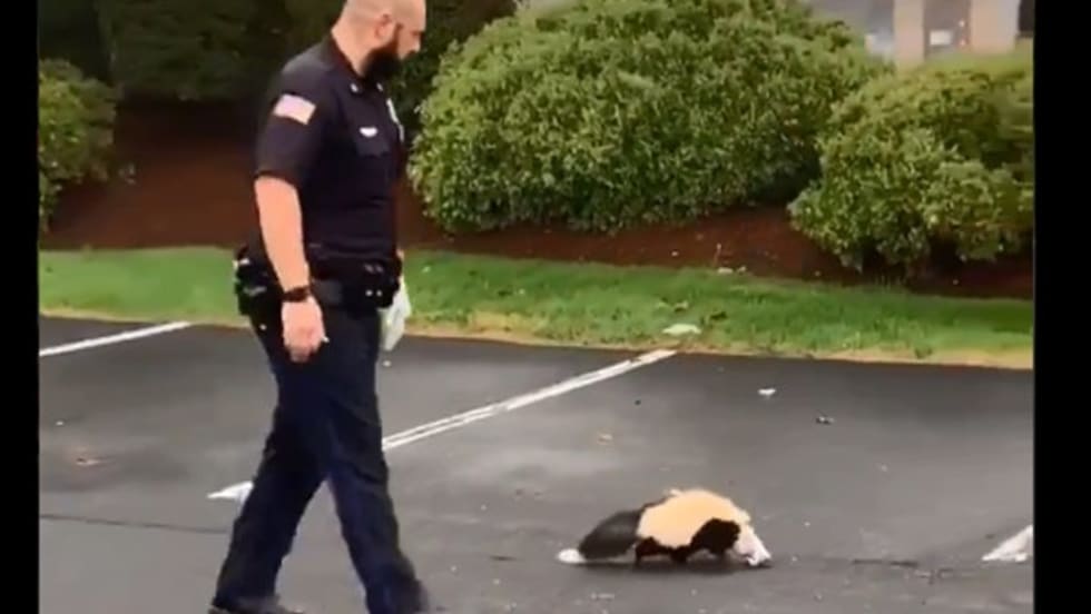 An officer with the Tewksbury (MA) Police Department managed to rescue a skunk over the weekend whose head was trapped in a plastic food container without being "skunked."