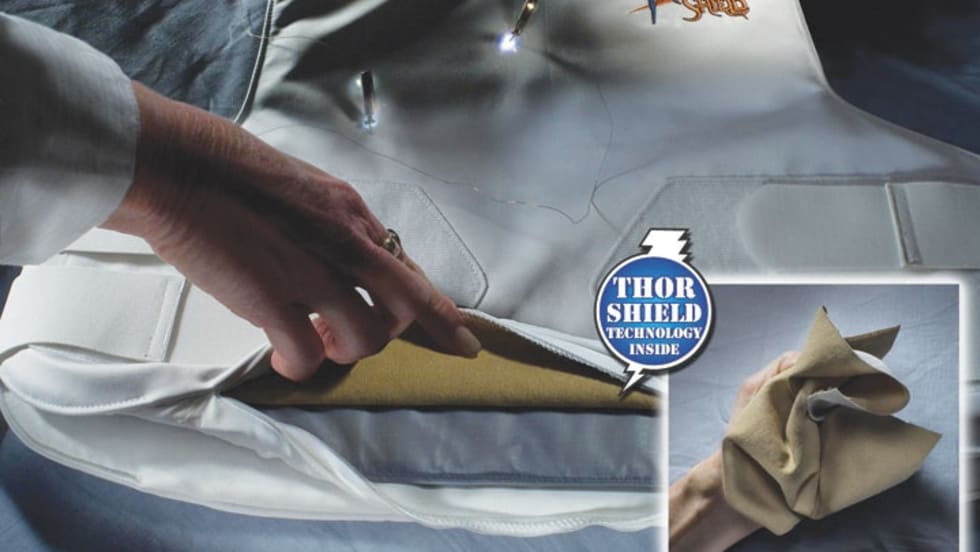 The ThorShield fabric backing on this Point Blank ballistic vest carrier effectively shorts out electro-conductive devices to prevent a shock.