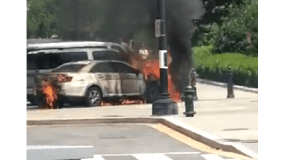 As the suspect was being arrested by backup officers, the car caught on fire from the piece of wood.