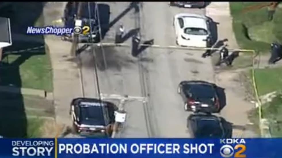 Police say a bullet penetrated the skull of the Allegheny County, PA, probation officer, and his client was shot five times. Police are looking for two suspects.