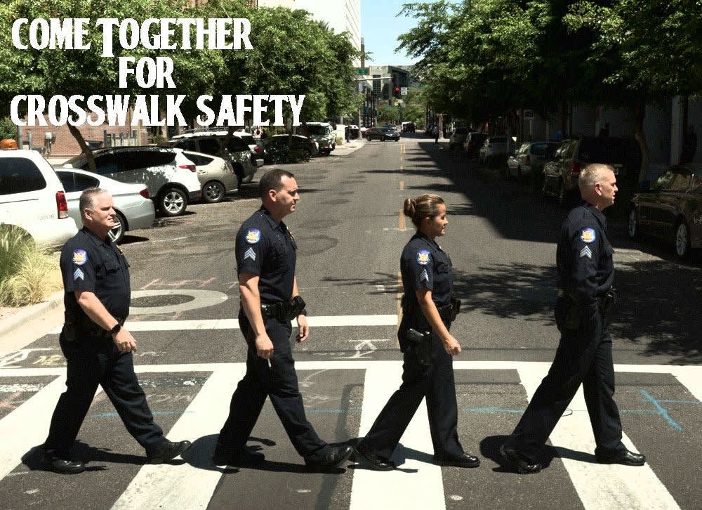 Read More →The Phoenix Police Department has launched a public safety campaign that uses clever re-imagined visuals from pop culture to urge people to use crosswalks when crossing the streets and drivers to be more attentive to the presence of pedestrians on the road. The "Rock the Crosswalk" campaign has the goal of reducing vehicle vs. pedestrian accidents in the city. Last year there were 101 vehicle vs. pedestrian collisions in Phoenix. (Photos: Phoenix PD/Facebook)