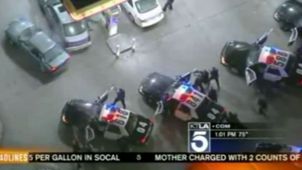Eleven Los Angeles Police officers fired more than 60 rounds at a car-jacking suspect at a Koreatown gas station while the station's owner was caught in the cross fire.