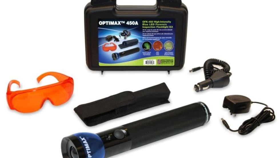 Spectronics Corp. has introduced the OFK-450A Blue Light LED Forensic Inspection Kit with its rechargeable Optimax 450 LED flashlight for crime-scene investigation, field evidence gathering, and laboratory work.