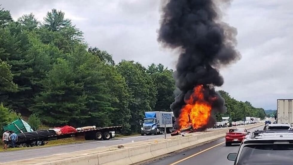 An Oklahoma Highway Patrol vehicle and a fire truck were struck by a tractor trailer while at an earlier accident scene. High winds may have been one of the contributing factors.