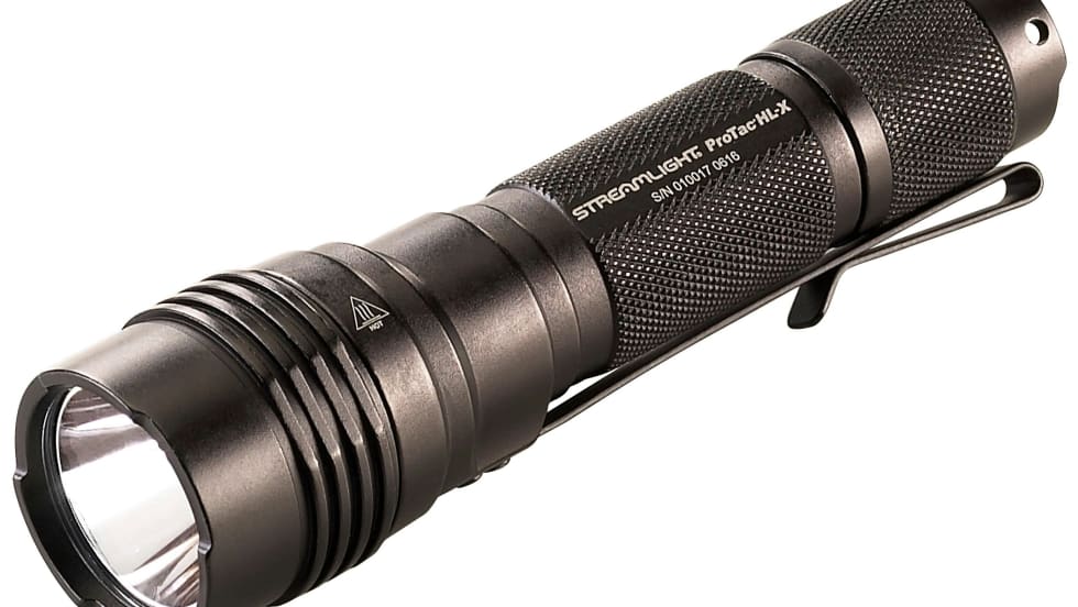 The ProTac HL-X flashlight, built for durability and a sure grip, is available as a complete rechargeable system that can use either a proprietary Streamlight SL-B26 protected Li-Ion USB rechargeable battery or two CR123A disposable batteries.