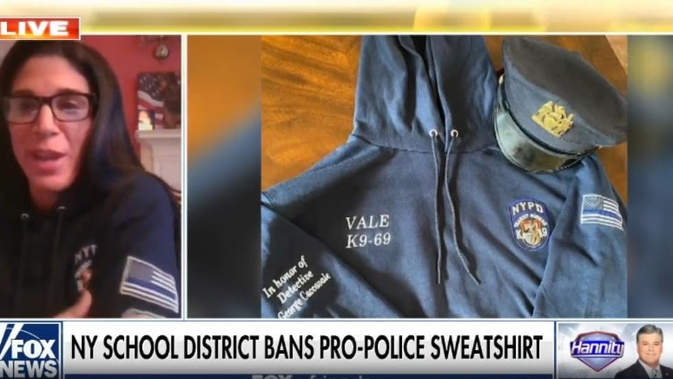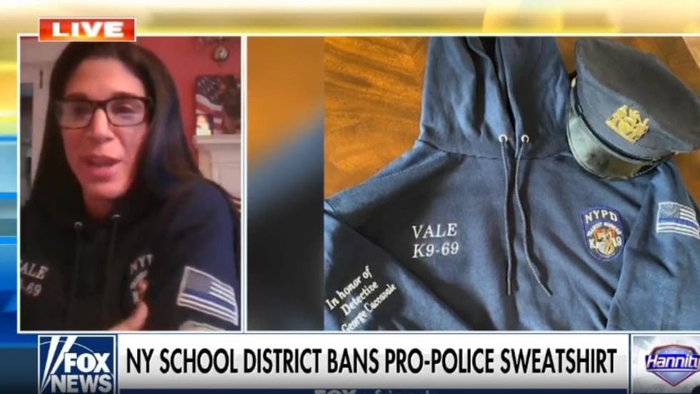 Carla Caccavale, whose father was fatally shot in 1976 when she was just 20 days old, called out the Pelham, NY, superintendent for allowing staff to wear Black Lives Matter-related gear while banning the sweatshirt with a patch honoring her father, Transit Police Detective George Caccavale.