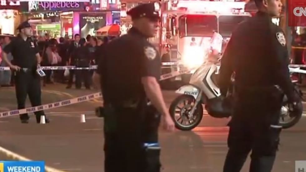 Two bystanders were hit when NYPD officers opened fire in Times Square on Saturday evening after a disoriented man jumped into the path of oncoming traffic.
