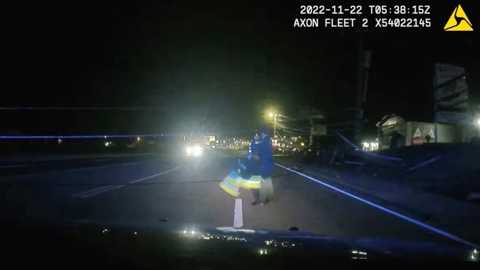 Upon realizing the trucker does not see the suspended lines the officer runs quickly away just before the truck snags the lines and drags them, and a utility pole, toward the officer and his patrol vehicle.