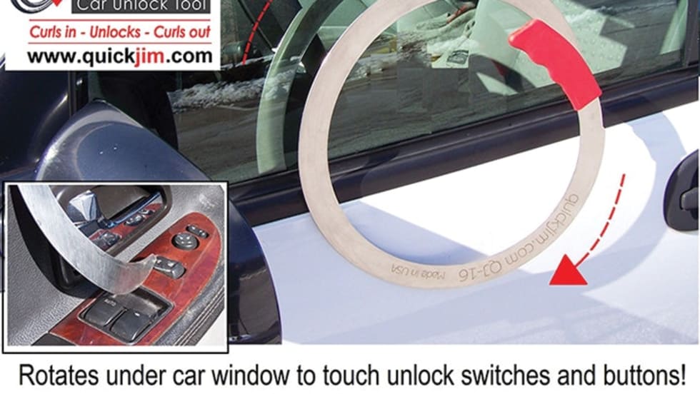 QuickJim is a new spiral tool that curls under a car's window to touch the unlock switch located on the armrest or door. QuickJim is designed to rotate out the way it went in and never get stuck.