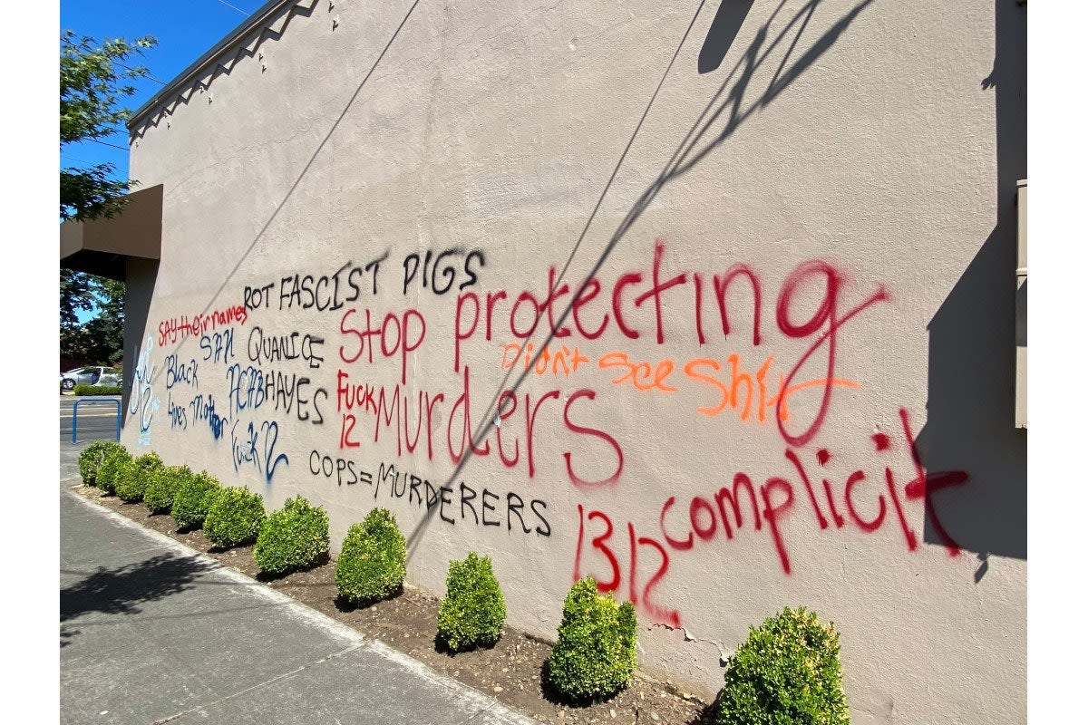 Shattered glass, broken windows, and words spray painted on buildings carried a message Sunday night in downtown Tucson, with “no cop city” written to reference a police training center in Atlanta.