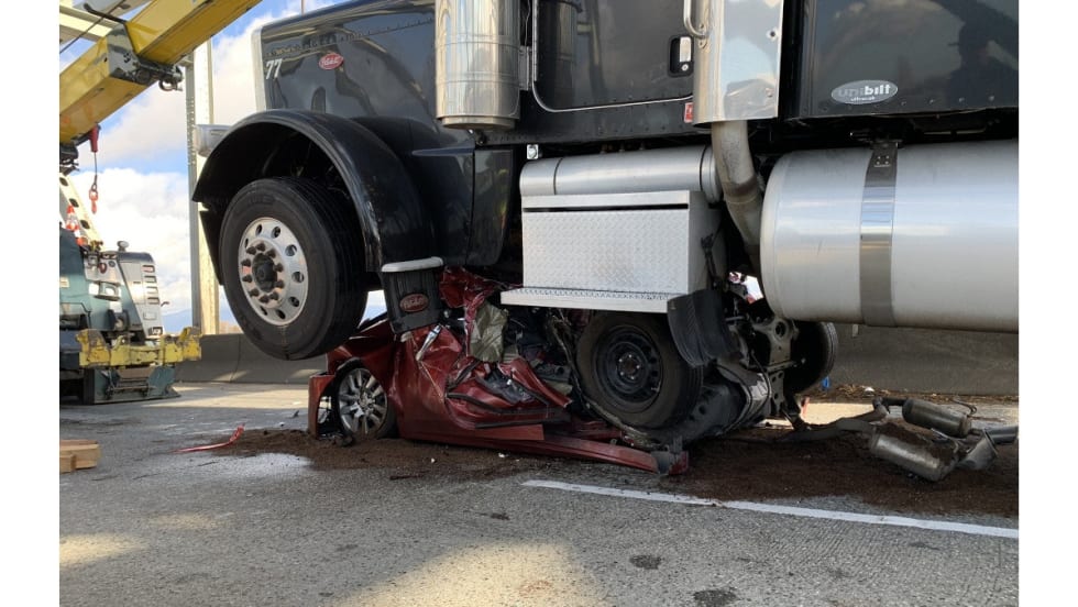 According to Trooper Rocky Oliphant, the truck struck the Altima from behind, before eventually coming to rest on top of the flattened vehicle.
