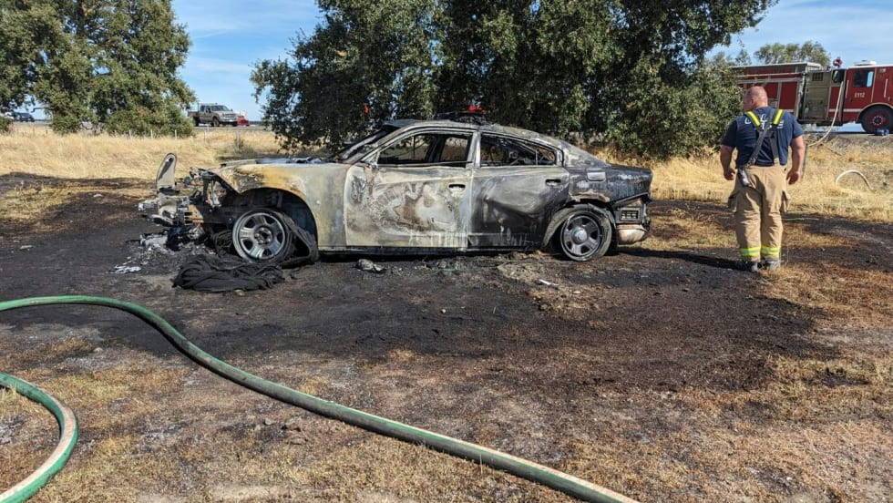 The suspect reportedly drove off in the CHP patrol vehicle and crashed into a semi truck, causing both vehicles to plunge down an embankment. The patrol vehicle burned.