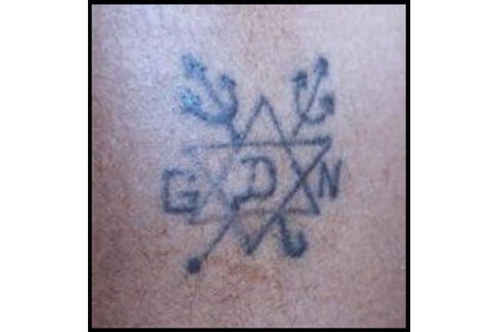 This Gangster Disciples Nation tattoo displays the Chicago-based gang’s most common symbols: a three-pointed pitchfork and a six-pointed star (Star of David) in remembrance of its co-founder 'King' David Barksdale (there is no connection to the Jewish symbol apart from the name of King David). GDN has an enormous presence in Chicago and other Midwestern cities such as Milwaukee, Minneapol