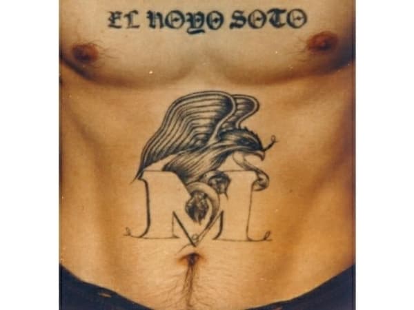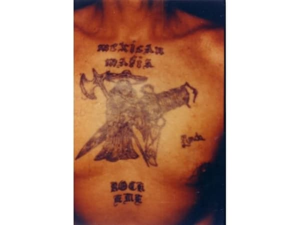 This Mexican Mafia tattoo depicts a Mexican Grim Reaper image. It is a memorial for Rocky Luna, a Mexican Mafia member who was killed by the gang for his role in the making of the movie "American Me." La Eme did not approve of the portrayal of its founder in the movie.